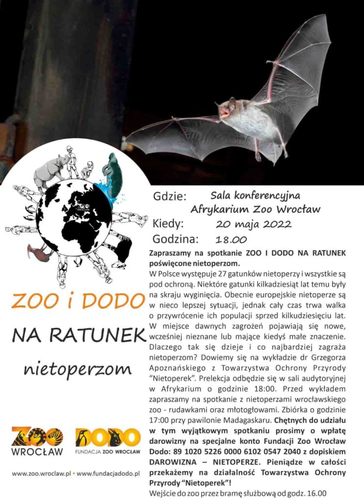 Chętnych do udziału w tym wyjątkowym spotkaniu prosimy o wpłatę darowizny na specjalne konto Fundacji Zoo Wrocław Dodo: 89 1020 5226 0000 6102 0547 2040 z dopiskiem DAROWIZNA – NIETOPERZE. Pieniądze w całości przekażemy na projekty ochrony nietoperzy prowadzone przez TOP “Nietoperek”.