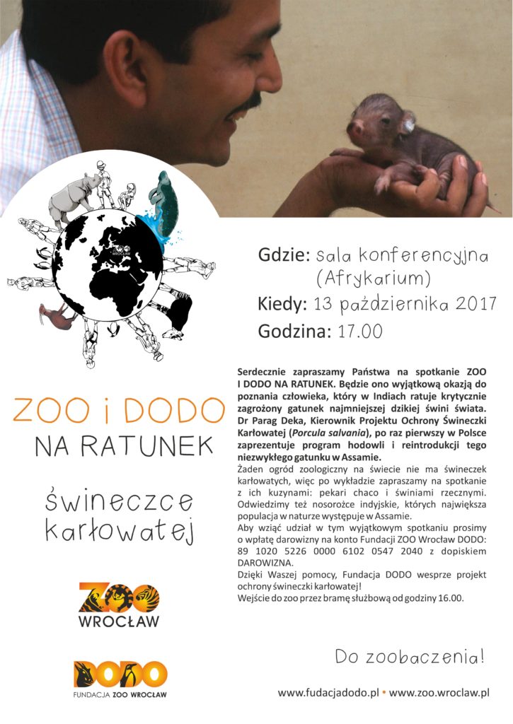 Tematem spotkania będzie ochrona świneczki karłowatej (Porcula salvania). Będziecie mieli wyjątkową okazję posłuchać szefa programu ochrony tego najmniejszego gatunku dzikich świń na świecie: dr Parag Deka, który przyjechał do nas z Indii i po raz pierwszy w Polsce zaprezentuje program hodowli i reintrodukcji tego zagrożonego gatunku w Assamie.